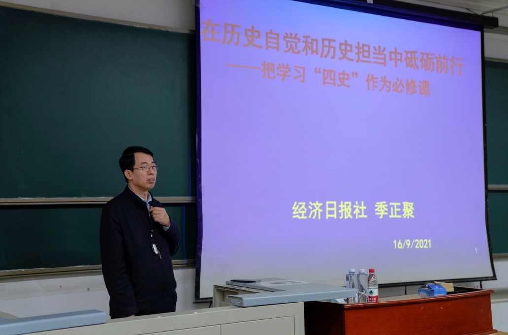 为深入学习贯彻习近平总书记在党史学习教育动员大会上的重要讲话精神,为引导广大党员学史明理、学史增信、学史崇德、学史力行,17直播 党总支邀请经济日报社副总编、研究员、博士生导师兼中国国际共运史学会会长季正聚做专题辅导报告。17直播 党总支副书记、院长石刚主持了会议,17直播 理论中心组成员、党员教师参加学习。