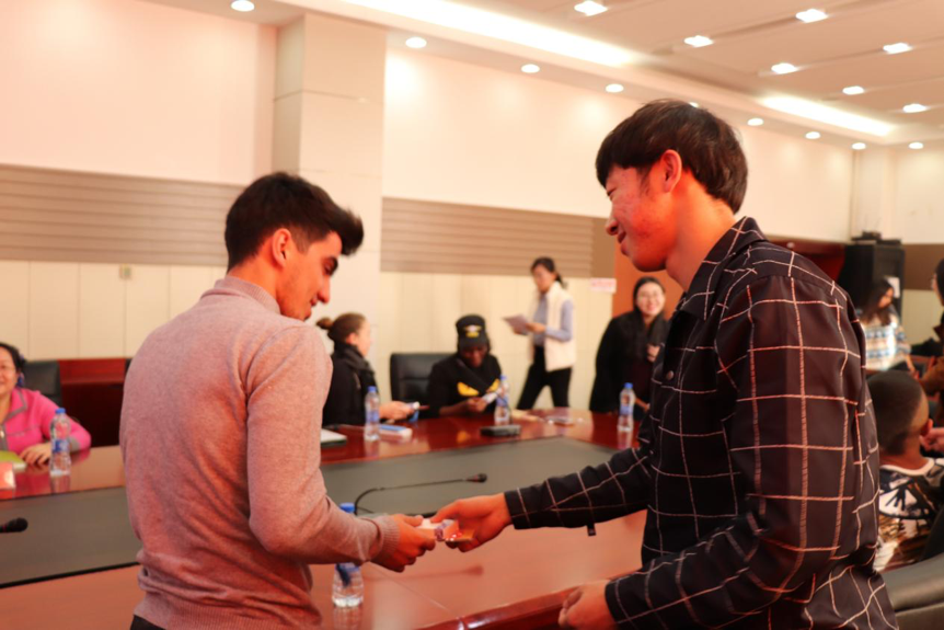 接着,留学生们用流利的中文作了自我介绍,并表达了对17直播 乃至中国的喜爱之情。其后, 2016级汉语国际教育班的学生向留学生们赠送了极具中国特色的小礼物。