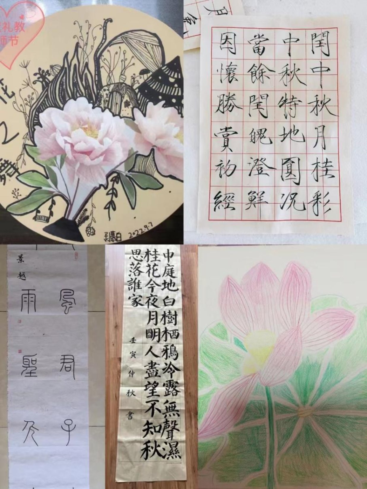 活动中,有的老师全家齐上阵,制作了创意与美味并存的月饼;有的老师巧手diy,制作了精美的中秋花灯、玉兔折纸;还有的老师寄情山水之间,或外出登高,或品茗作诗、挥毫泼墨,值此秋高气爽之际,快意人生!虽不在一地,但天涯共此时,在17直播 群中,老师们通过图片、视频的形式互相传递着中秋节和教师节的思念与祝福,使节日的气氛更显浓厚。
