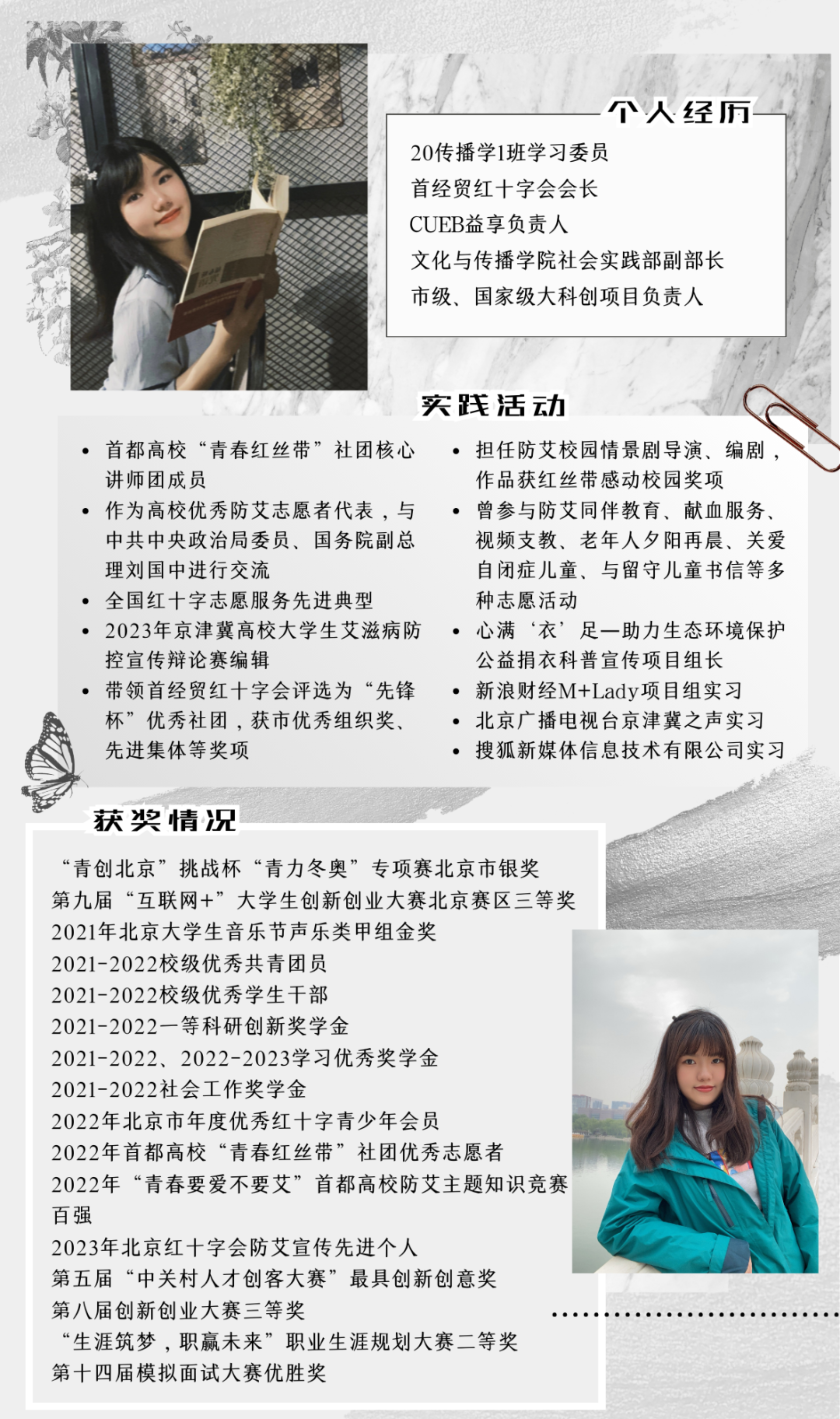 她好似璀璨之星,是首都高校“青春红丝带”社团核心讲师团成员,作为高校优秀防艾志愿者代表,在北京地坛医院与中共中央政治局委员、国务院副总理刘国中进行交流。