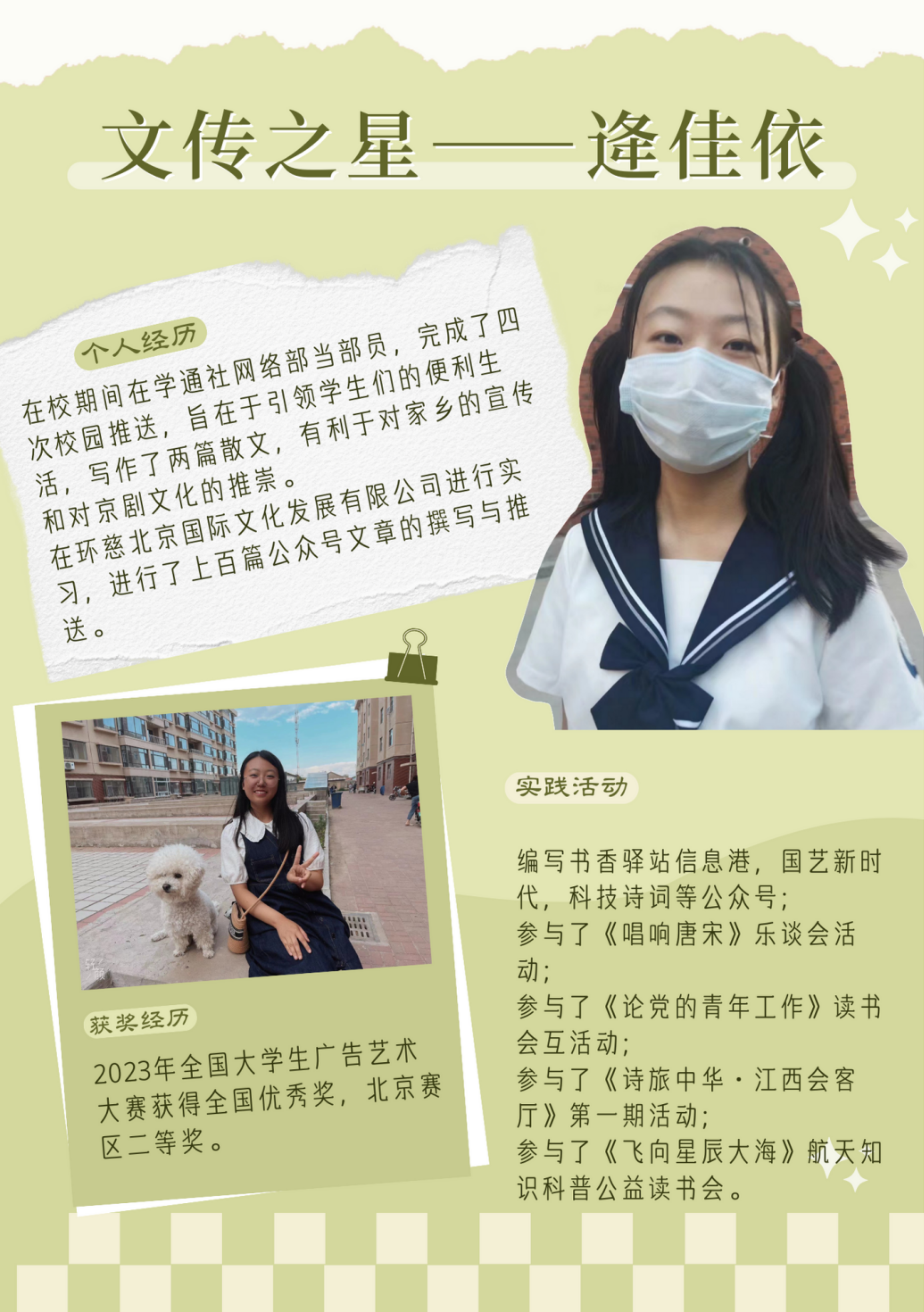 有榜样的地方,就有进步的力量!寻找文传新星,汇聚文传学子前行的力量,我们相信每位同学都会有发光的一面,我们会从身边的同学入手,挖掘他们身上不同的优秀品质,以此为大家树立榜样,希望大家可以从本栏目中有思有学,成就更好的自己!