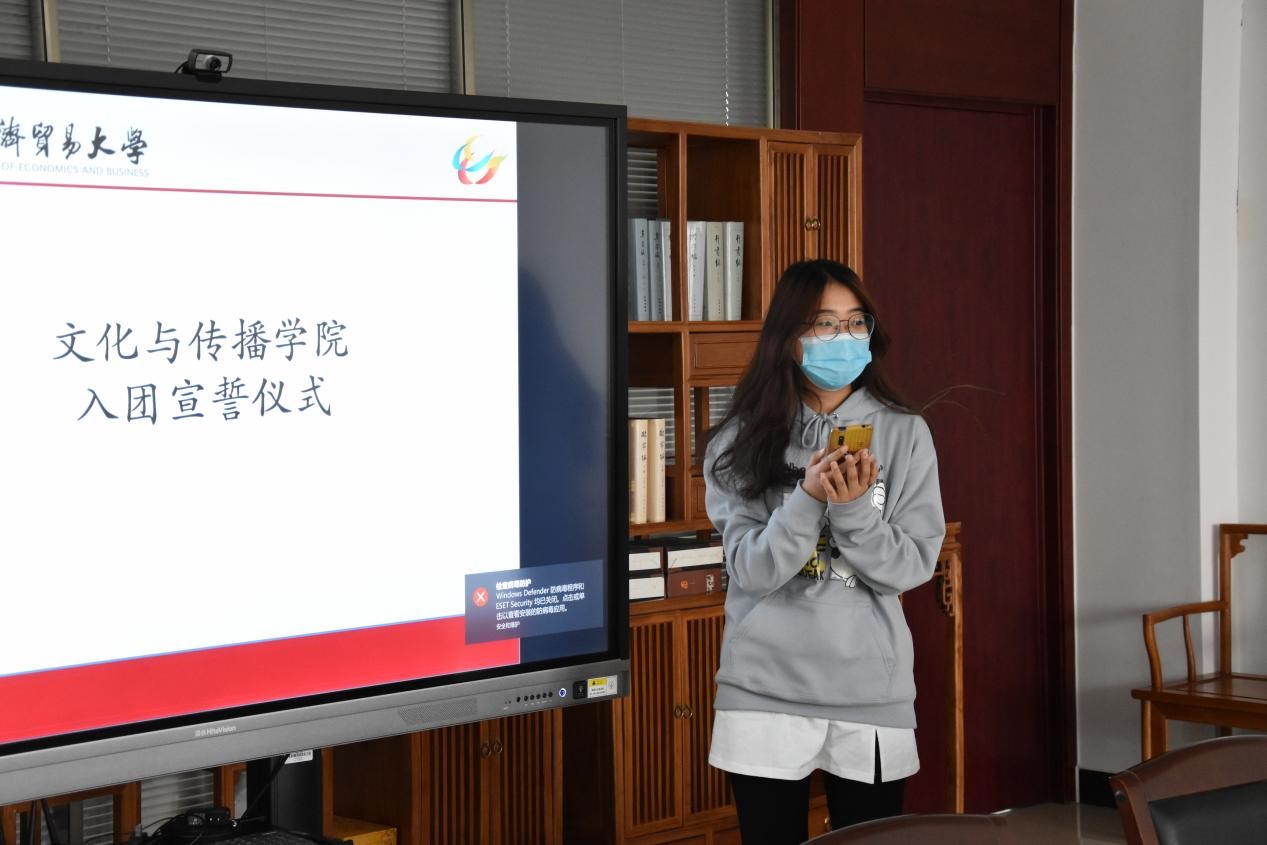 2020年12月17日中午12:10,17直播 分团委组织2020年度新发展团员进行入团宣誓仪式。参加本次会议的有分团委书记郭奕彤,分团委副书记张·乌日罕、颜丽郦,组织部部长侯子怡、吴佳妮、韩雪娟,以及两位新发展团员张公泽、董李。本次团员发展大会由组织部部长侯子怡主持。