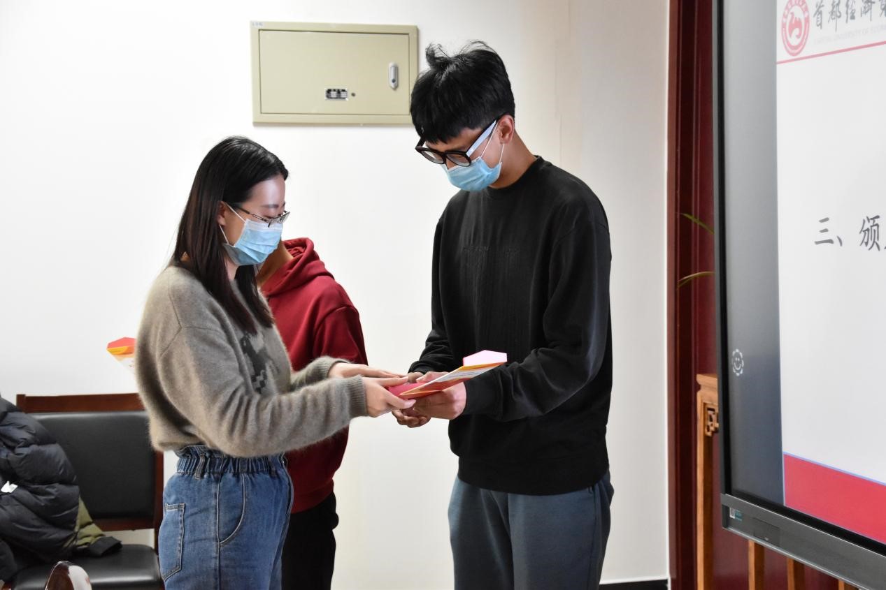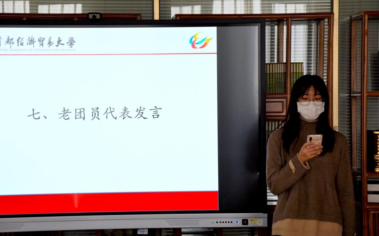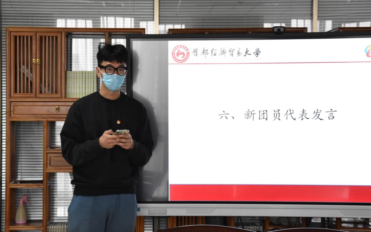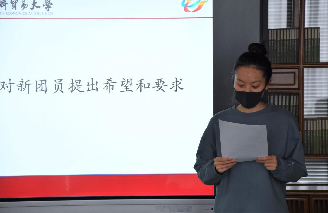 首先,由侯子怡宣布新团员名单:18级传播学一班张公泽和19级传播学三班董李,光荣地加入了中国共产主义青年团。