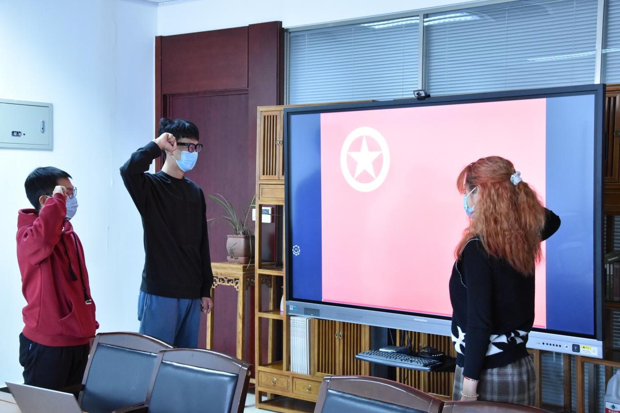 接下来,由老团员韩雪娟带领两位新团员进行宣誓。新团员在老团员的带领下,面向团旗,右手握拳,庄严宣誓。誓言字字铿锵,充分展现了两位新团员为中国共产主义事业奋斗的决心。