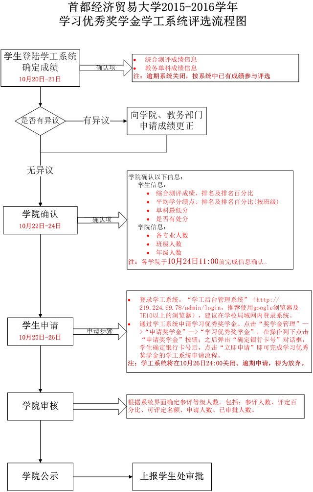 1.提交申请。学生本人或集体(团队)负责人向所在17直播 提交书面申请。各类表格模版请见本通知附件2。学习优秀奖学金学工系统评选操作流程详见下图。