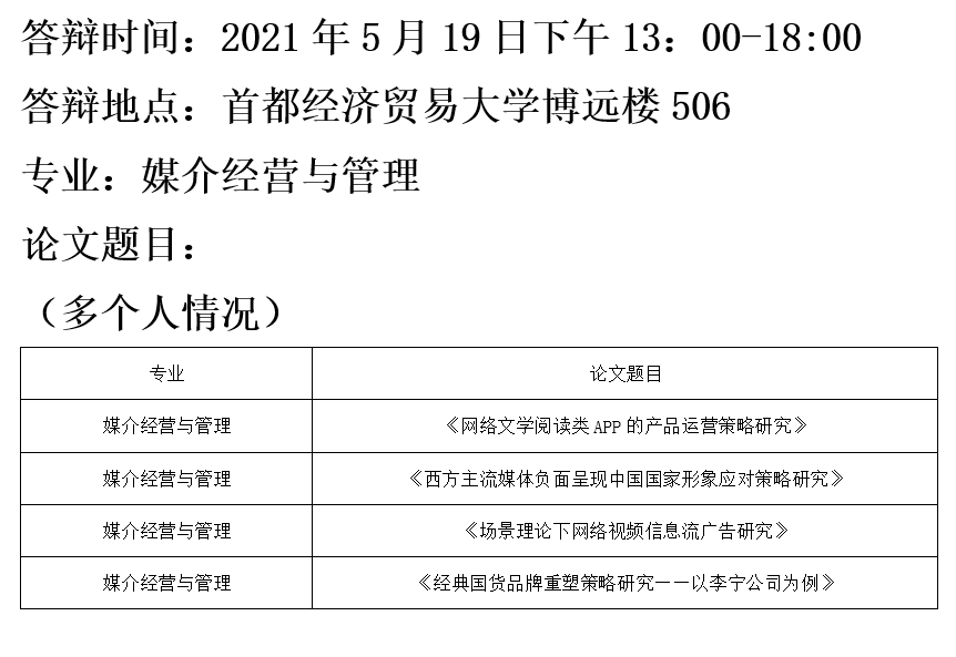 硕士学位论文答辩公告(媒介经营与管理)