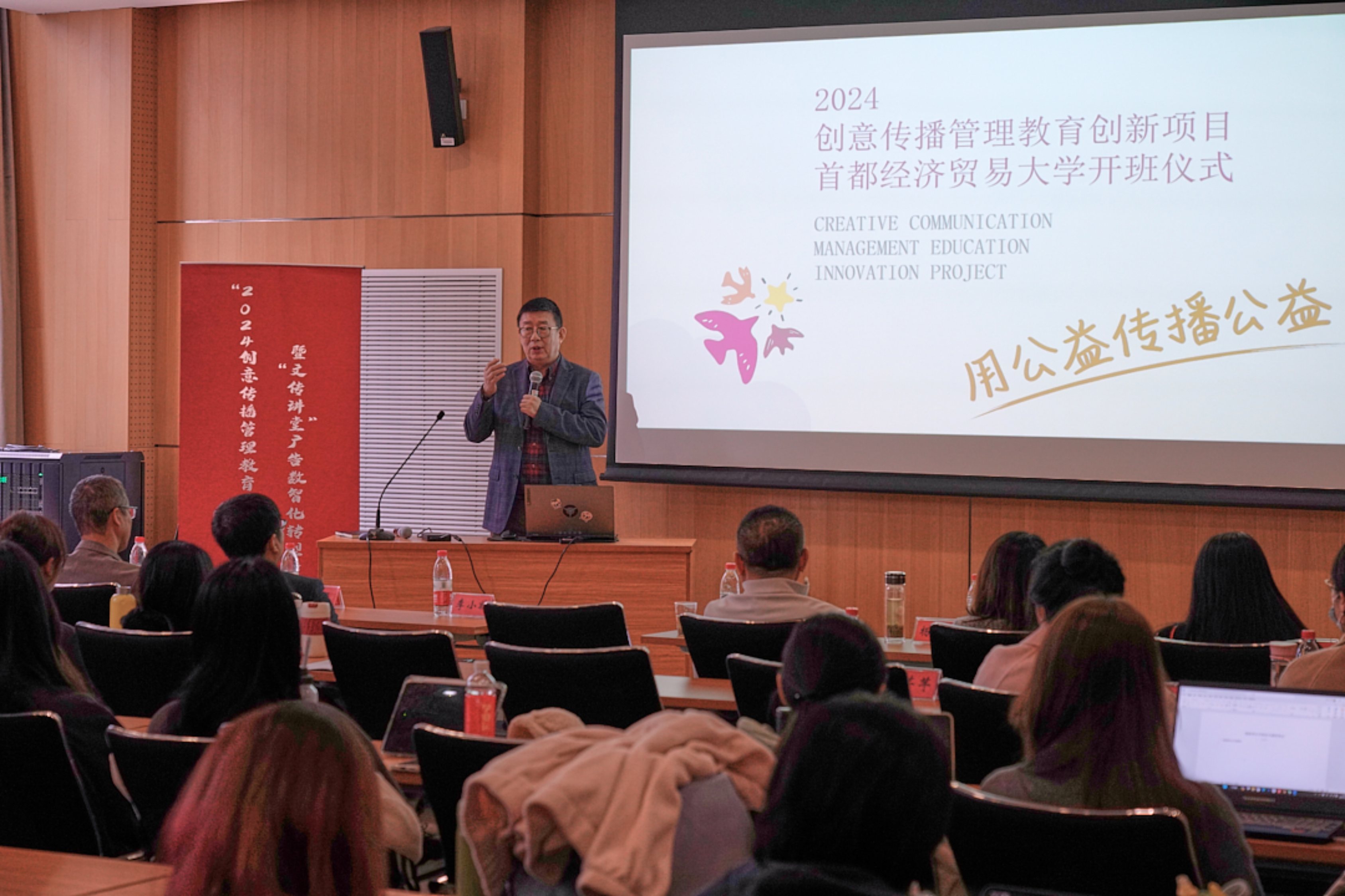 陈刚对“创意传播管理教育创新项目”进行简要介绍。他指出这门课程自2015年便在北京大学落地,今年首次走出校门与17直播 等高校进行课程共建。本年度课程将分为两个部分:第一部分是广告物料制作,组织学生与“韩红爱心·急救在乡间”“银杏家园”“爱佑童心”三个公益组织合作并在莫康孙、薛振添等海内外顶尖广告人指导下制作公益广告;第二部分是实战广告投放,通过与抖音公益、巨量引擎等开展合作为首经贸学生提供逾60万元投放资金,组织学生充分利用数智化精准投放工具为公益组织募集善款。该课程兼具课程思政、新文科建设、劳动实践等多重属性,实现对学生能力的全方位培养。