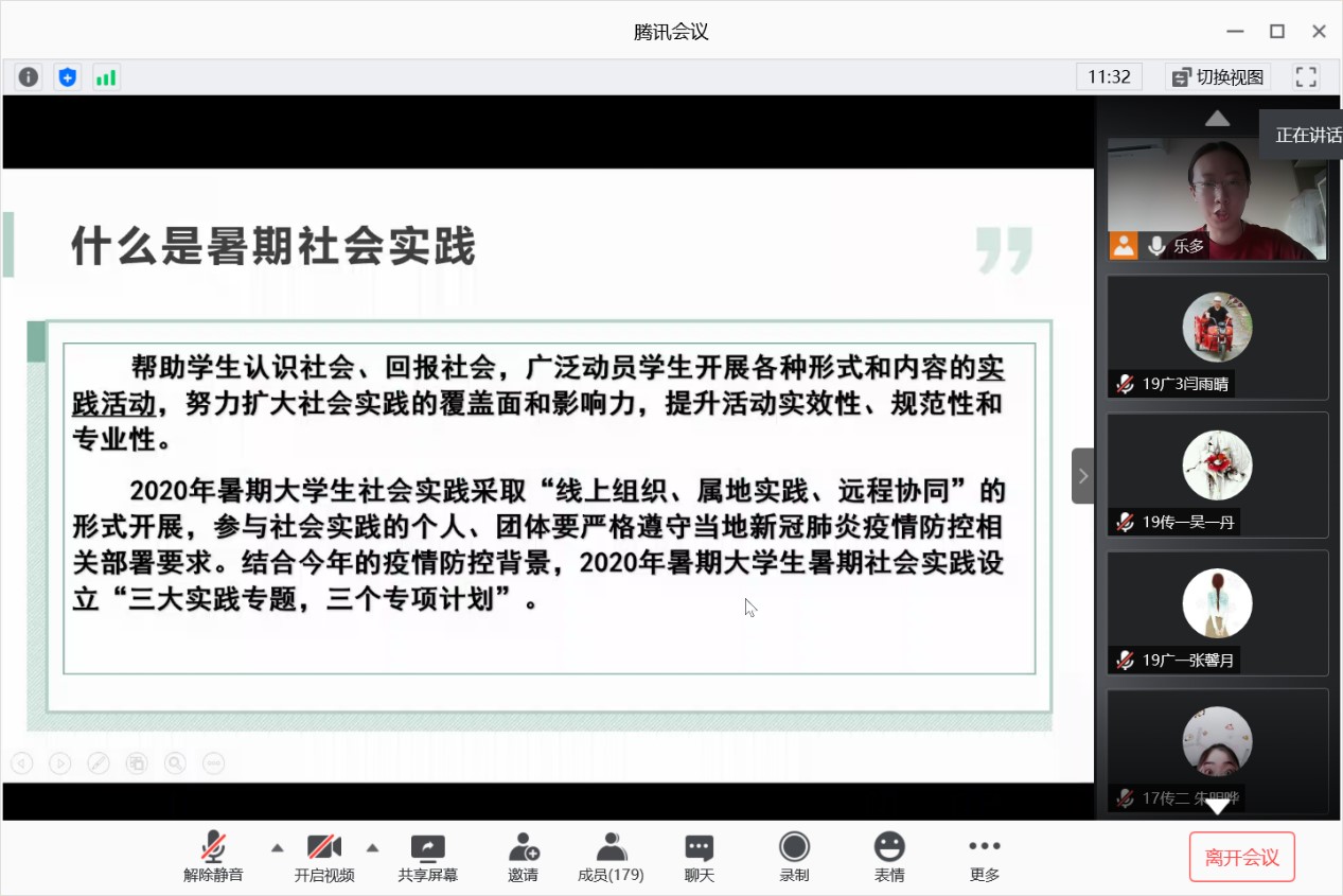 首先,郭奕彤老师向我们介绍了暑期社会实践。本次暑期社会实践主题是围绕疫情防控、脱贫攻坚、安全健康而展开的,郭奕彤老师还向我们讲解了参与社会实践的方式、时间规划、评比规则,并且给我们分享了往届参与社会实践的作品,鼓励我们积极参与暑期社会实践。