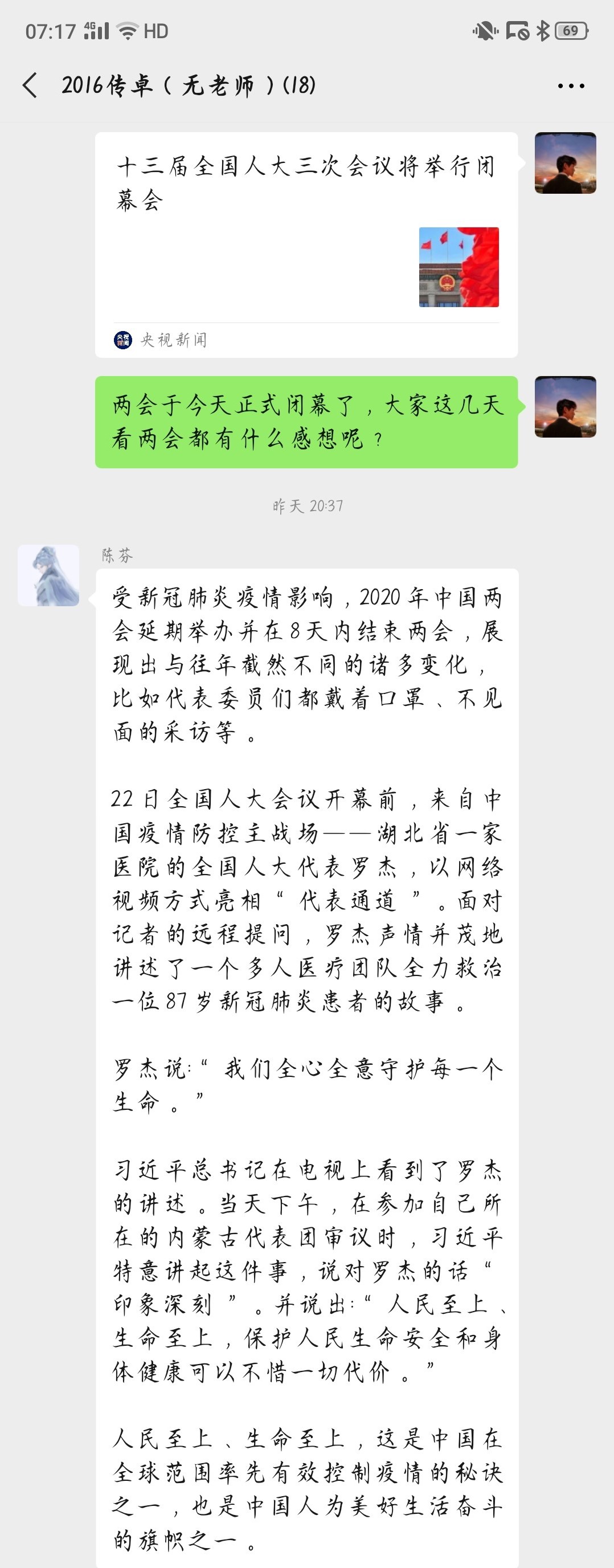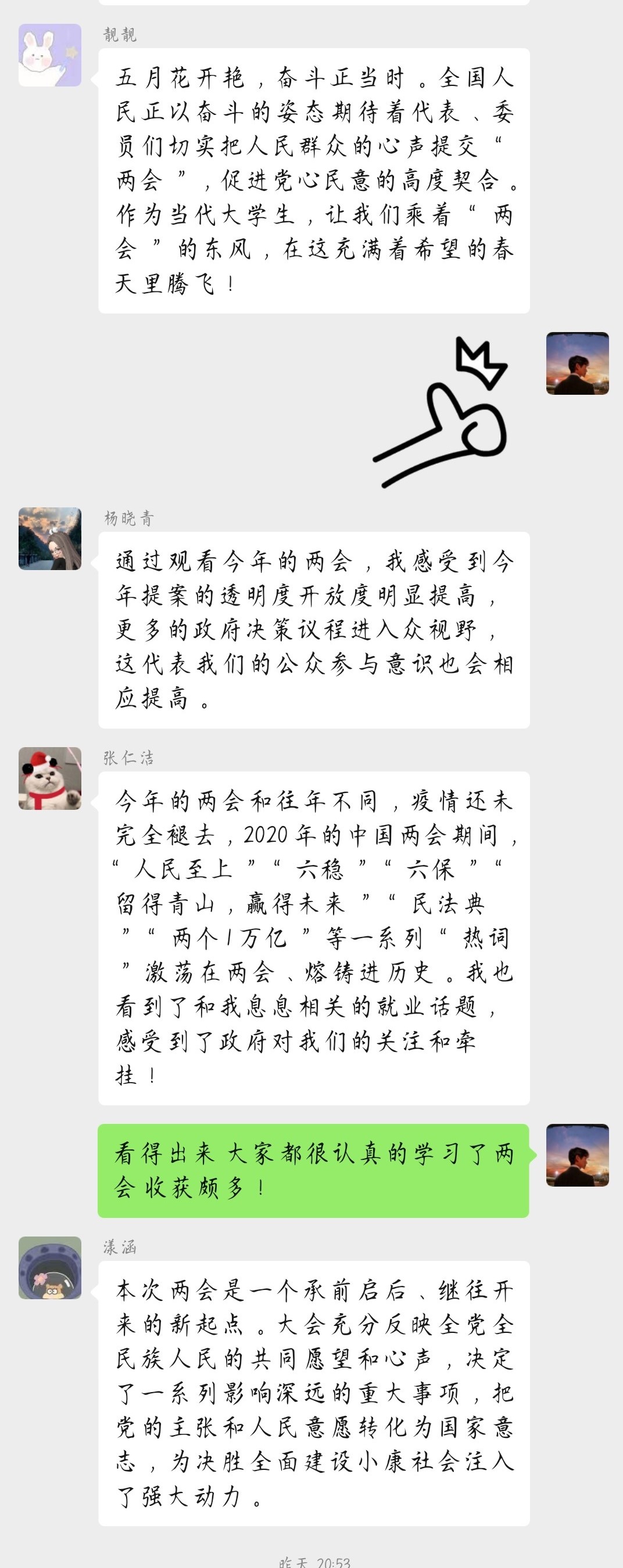 为响应号召,17直播团员青年通过互联网、手机客户端、电视等多种方式,密切关注两会盛况,学习两会精神。2020年是新中国成立71周年,是决胜全面建成小康社会的关键之年,这次的政府工作报告简明扼要、重点突出,全面覆盖各个领域。主要有去年和今年以来的工作回顾、今年重要目标、今年部分重点工作三部分组成,字里行间展示了国家始终把人民的生命健康安全放在第一位的立场和态度,表明了当代中国人民有战胜任何挑战的坚定意志和能力。