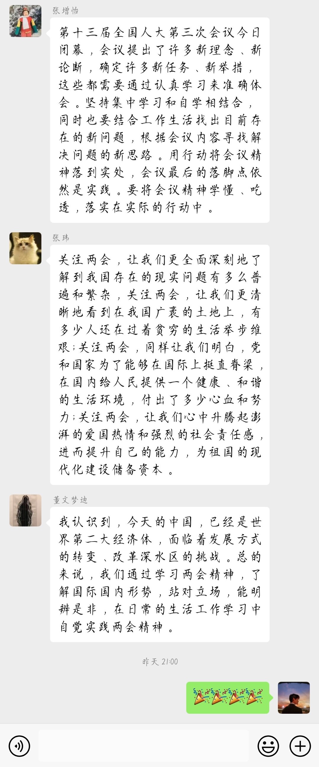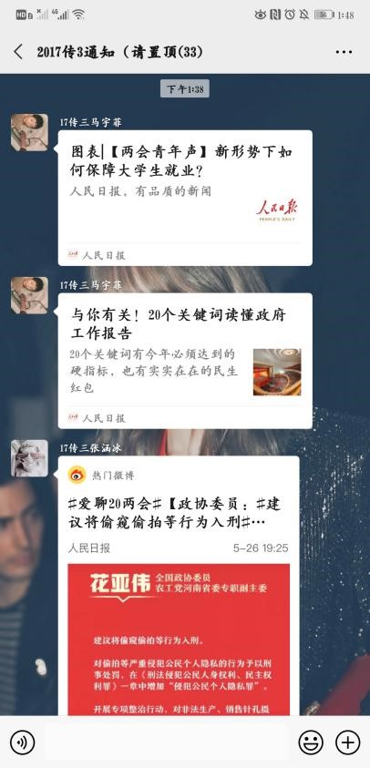 不凡之年,信心之会。从“延迟”到“重启”,在疫情防控常态化阶段召开“两会”,不仅是国家给全社会注入的一剂战“疫”必胜的“强心剂”,还是向全世界传递了患难与共的中国担当、唱响了坚持开放合作的中国旋律,为全球团结抗“疫”提振信心。希望17直播团员青年以此次学习为契机,将学习贯彻习近平新时代中国特色社会主义思想引入新阶段、推向新高潮,了解社会发展趋势,关注“两会”热点信息,明确学习目标,增强学习动力,努力成为新时代中国特色社会主义思想的建设者和接班人。