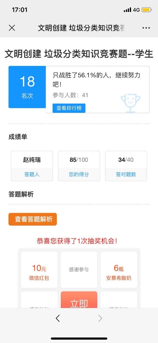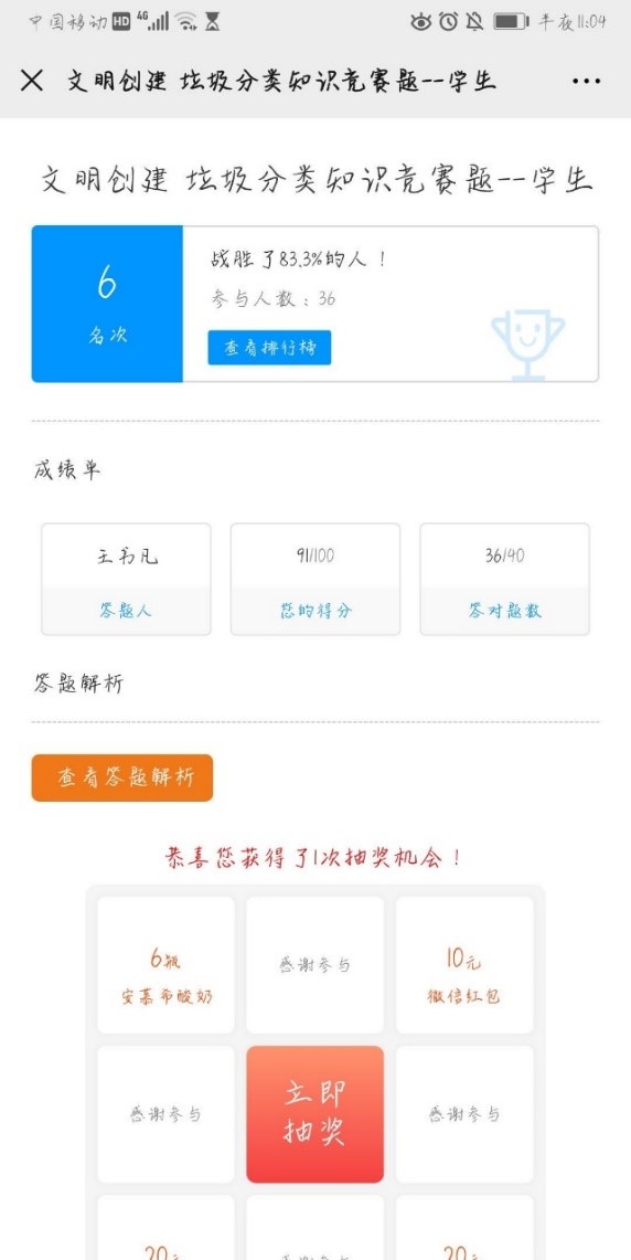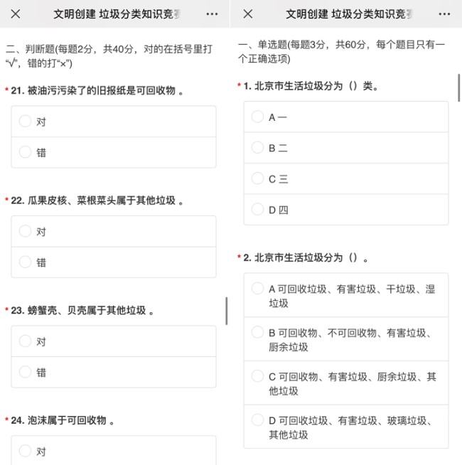 5月23日,17直播 党总支分享了有关垃圾分类知识的竞赛题目40道,本科生党员们答题热情高涨,纷纷转发答题并在微信群里互动讨论,上网搜索学习各种垃圾分属哪一类,还对照着小区橱窗内的宣传海报进行了深入了解。垃圾分类竞赛活动增强了大家对垃圾分类知识的了解,让“绿色、低碳、环保”的理念深入人心。本科生第一党支部党员刘琳说:“通过填写垃圾分类知识竞赛题,深深感受到自己在垃圾分类方面的知识还欠缺得很多,还有很多题目不确定甚至答错,这说明在平时还应该多多关注北京市垃圾分类相关规定,通过多种形式了解垃圾分类标准,锻炼提升自己垃圾分类的能力,起好党员的先锋模范带头作用,真正践行垃圾分类,党员先行!”