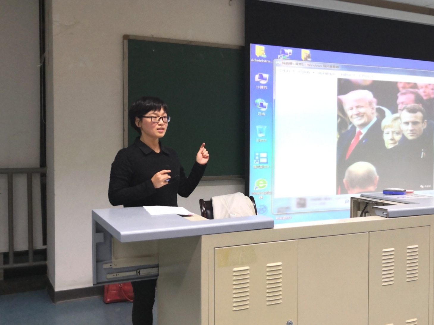 讲座伊始,吴秀芳对国际新闻做了简要介绍。吴秀芳以几张新闻照片作为引入,解读其中细节背后复杂的国际关系。之后简单介绍了当前的国际时势和中美关系,作为讲解国际新闻的铺垫。吴秀芳说,国际新闻,是要对内告知国际时事,对外宣告中国的立场,扩大中国的影响,来争取更多朋友。随着中国融入全球化,以及近年来外部环境的变化,大众对国际新闻的关注度提高。