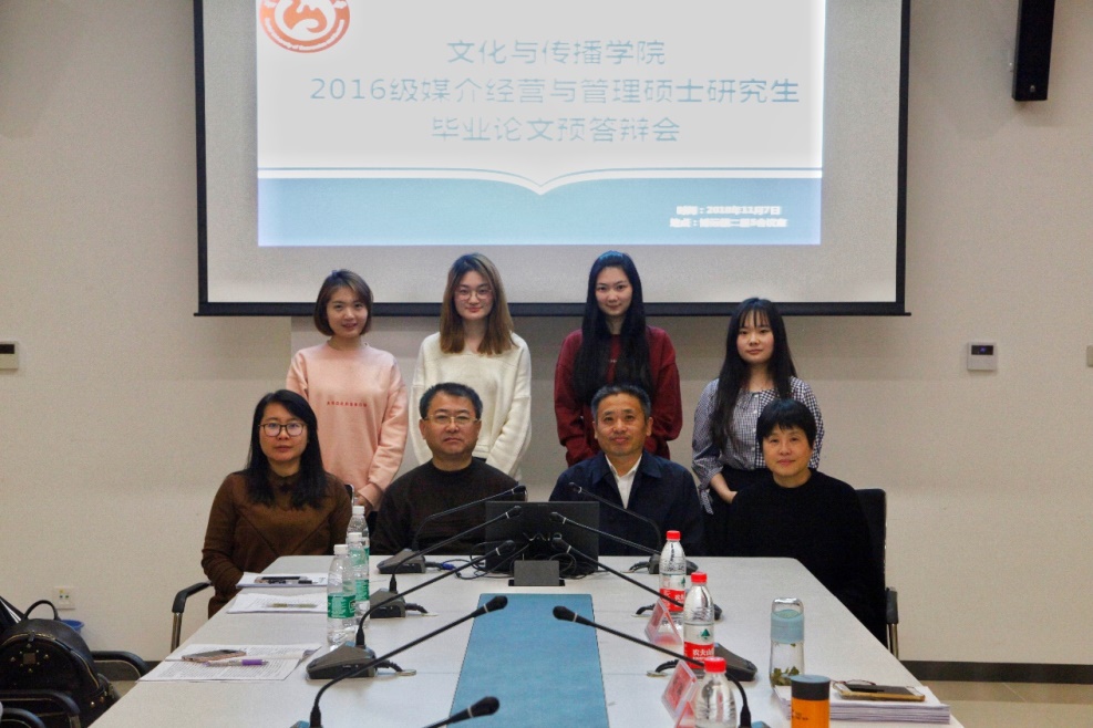 最后,2017级毕业论文开题结束后,由院长石刚、杨同庆教授、朱琳教授、院长助理许敏玉四位老师组成的评议组,又集中听取了2016级研究生毕业论文汇报。四位研究生分别从论文的选题背景、研究问题(假设)、研究方法、研究框架与内容、研究逻辑和结论等方面,全面介绍已经完成的论文及准备情况,完成预答辩。研究生的毕业论文涉及场景营销、文娱产业发展研究、IP开发研究、网络综艺研究等选题,跨管理学、经济学、传播学、广告学等多门学科理论和专业领域。