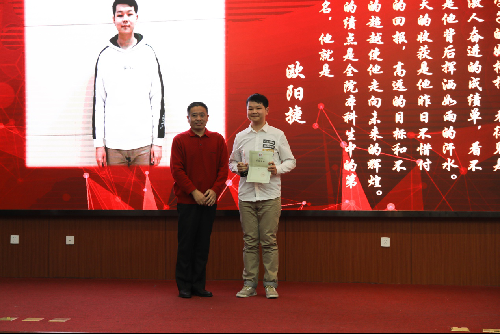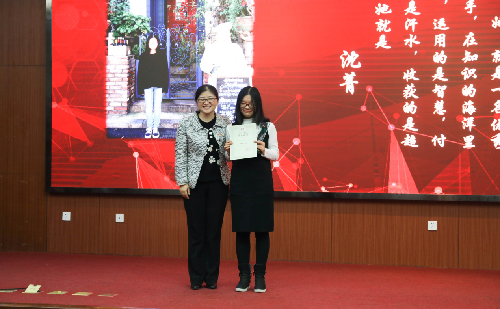首先颁发的是“学习之星”。2014级传播学卓越班的欧阳捷和2015级研究生沈菁以优异的学习成绩和丰富的学术经历荣获此项荣誉。欧阳捷在全院本科生中学习成绩平均绩点最高。沈菁多次获得奖学金和校级三好学生称号,已经发表两篇学术论文。他们在台上向大家分享了学习心得以及学术研究的经验和方法。随后石刚和党总支书记付琳上台分别为欧阳捷和沈菁颁发奖杯及证书。