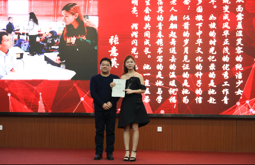2014级汉语国际教育班的张意英在本次颁奖典礼中被评选为“工作之星”。张意英刚结束美国田纳西州的实习项目回国,她曾任职17直播 学生会副主席、文艺部部长,还热心公益,广泛参与社会活动。现场播放的小视频让大家对张意英有了更深入的了解。她丰富的工作经历让她无愧于“工作之星”这个称号。
