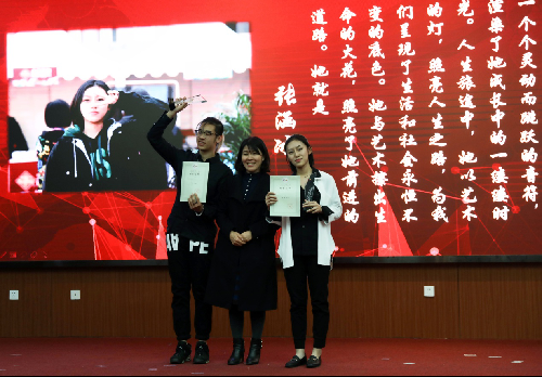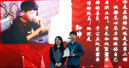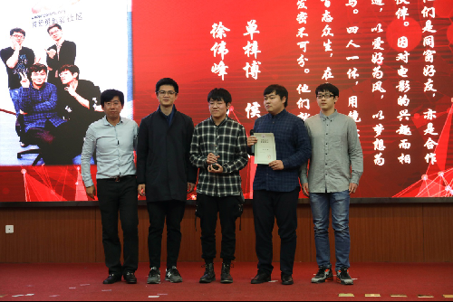 2015级的单梓博、侯悦、徐伟峰、杨世麒四位同学被授予“团队之星”。他们所负责的LOGIC工作室曾获得金驼微影视节一等奖和“室友杯”中国高校电视奖一等奖,还负责校团委129晚会视频制作。他们在台上分享了成立工作室的初衷和在这个过程中遇到的困难,这个工作室是几个志同道合的朋友实现梦想的开始。