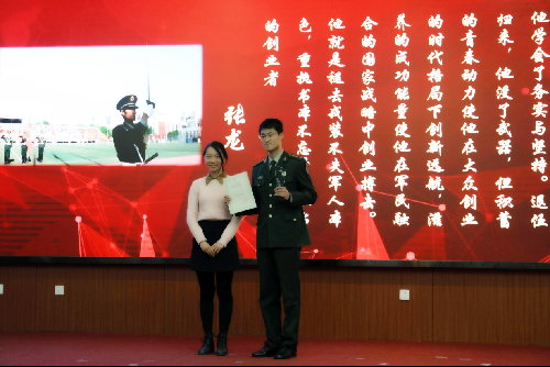 最后颁发的是“创业之星”,获得者是2015级传播学2班的张龙。他讲述了自己参军入伍和退伍后的创业经历,他身上的坚毅品质值得每一个人学习,并以实际行动诠释了新时代青年的使命和担当。