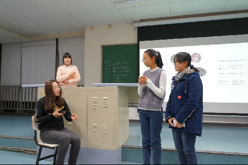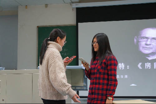 首先进行展示的是汉语国际教育班。分享书目为哈罗德·品特的《送菜升降机》。展示学生别出心裁地运用演员试戏的方式,为台下观众展现了故事的三个片段,让大家清晰地了解了故事的脉络。