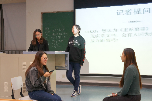 接下来上场的广告学一班巧妙地运用新书发布会的形式带来了纪实体小说《重返狼群》。该书主要讲述了一个出生于成都的女人李微漪在若尔盖草原偶然拯救了一只出生近五天的小狼崽,从此与狼一起生活,其间经历酸甜苦辣,最后成功放归狼的故事。新颖的书籍类型和别出心裁的表演形式令人印象深刻。