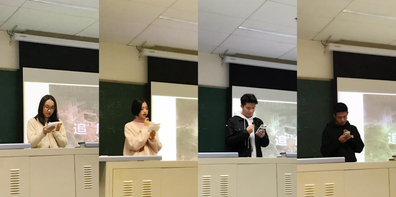 然后传播学三班的学生向大家分享了美籍阿富汗作家卡勒德·胡赛尼的《追风筝的人》。介绍完主要内容和创作背景之后,他们饱含情感地朗读了书中的经典片段,在场学生都深深地陶醉在一个富家少年与家中仆人放风筝的故事中。大家在短短几分钟的朗读中感受到了时代感与高度的文学质感,体会到了其中蕴含的丰富意象和文字魅力。