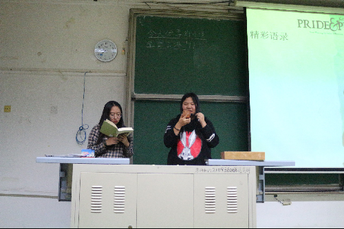 第五个上台分享的是来自广告学一班的学生,分享书目为《傲慢与偏见》。展示学生首先介绍了该书的写作背景,随后分享了书中优美段落,通过分享,在座师生感觉到简·奥斯汀以她温柔的笔触向人们描绘出彼时英国乡镇的一幅美好爱情画卷,唤起每个人心中对爱情的无限向往。