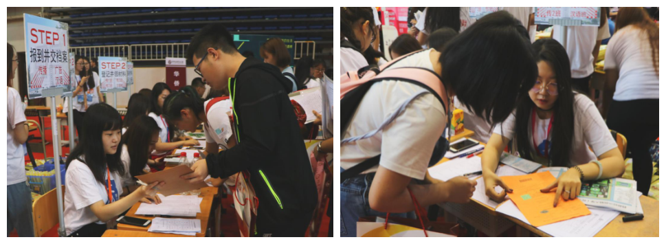 早上八点左右,已有新生陆陆续续前来报到,按照之前学生工作办公室精心设计的报到流程,新生来到体育馆外一次报到处,在几位学团志愿者的引导及帮助下,进行录取通知书核实及签到,并领取院服。在这里,新同学们得以获知分班情况,与班导生初次见面。