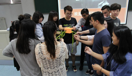 参观结束后,留学生们来到了13级汉语国际教育班的课堂上,两个班级进行了丰富而精彩的互动。首先是结对子活动,两个班各十四位同学,各执绳子的一端,牵着同一根绳子的两人即结对。随后十四对结对伙伴都上台向大家进行了自我介绍。在大家互相认识之后,13级汉语国际教育班的同学们拿出了早已准备好的礼物,赠送给了自己的结对伙伴,在这个过程中,双方学生开心地交流、互留微信。之后,为表达对留学生们的欢迎,13级汉语国际教育班的同学进行了精彩的歌舞表演,引得满堂的鼓掌与喝彩。