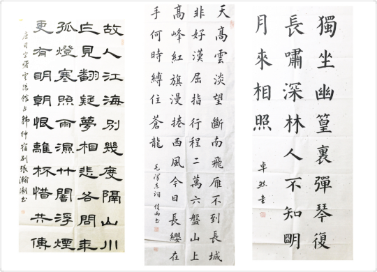 决赛包括定题书写和选题书写两个部分,在本次比赛特等奖选题书写的角逐环节,我校三名选手沉冷静参赛,依次从古文出处及参赛书体角度对自己的作品进行陈述,在有限的时间里发挥出了自己的最好水平,表现出了较好的心理素质和专业水准,体现出良好人文知识的积淀。