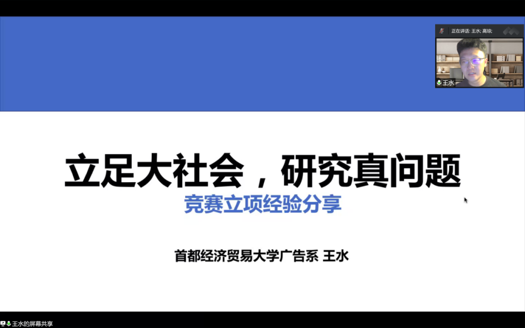 2022年5月26日19:30,17直播“扬帆未来,筑梦远航”系列竞赛立项经验分享会在线上如期举行。本次会议由党总支副书记高琼主持,广告学系党支部书记兼系副主任王水主讲。