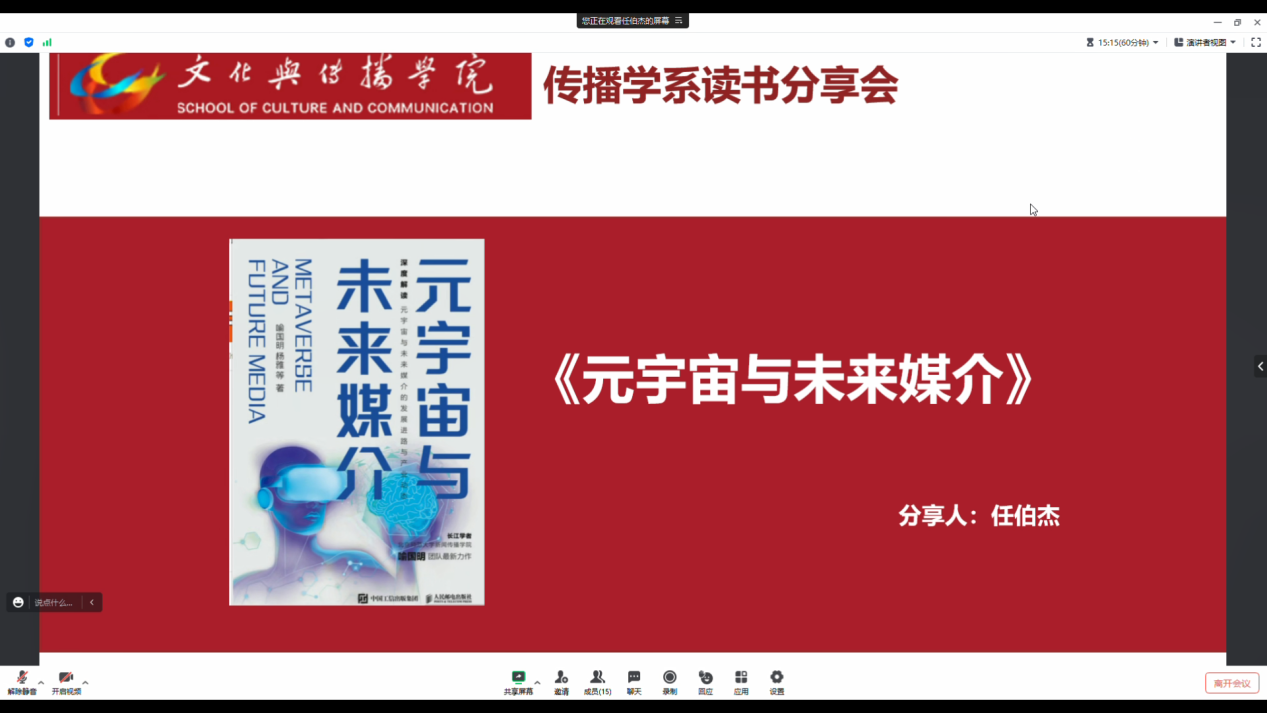 2023年7月4日上午9点,在17直播 传播学系主任贺心颖的主持下,传播学系第七期读书分享会在线上举行。传播学系教师任伯杰对《元宇宙与未来媒介》一书进行分享,传播学系全体教师参加了会议。