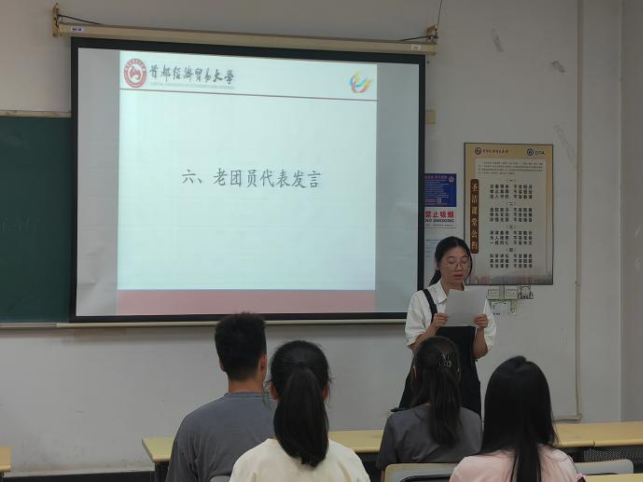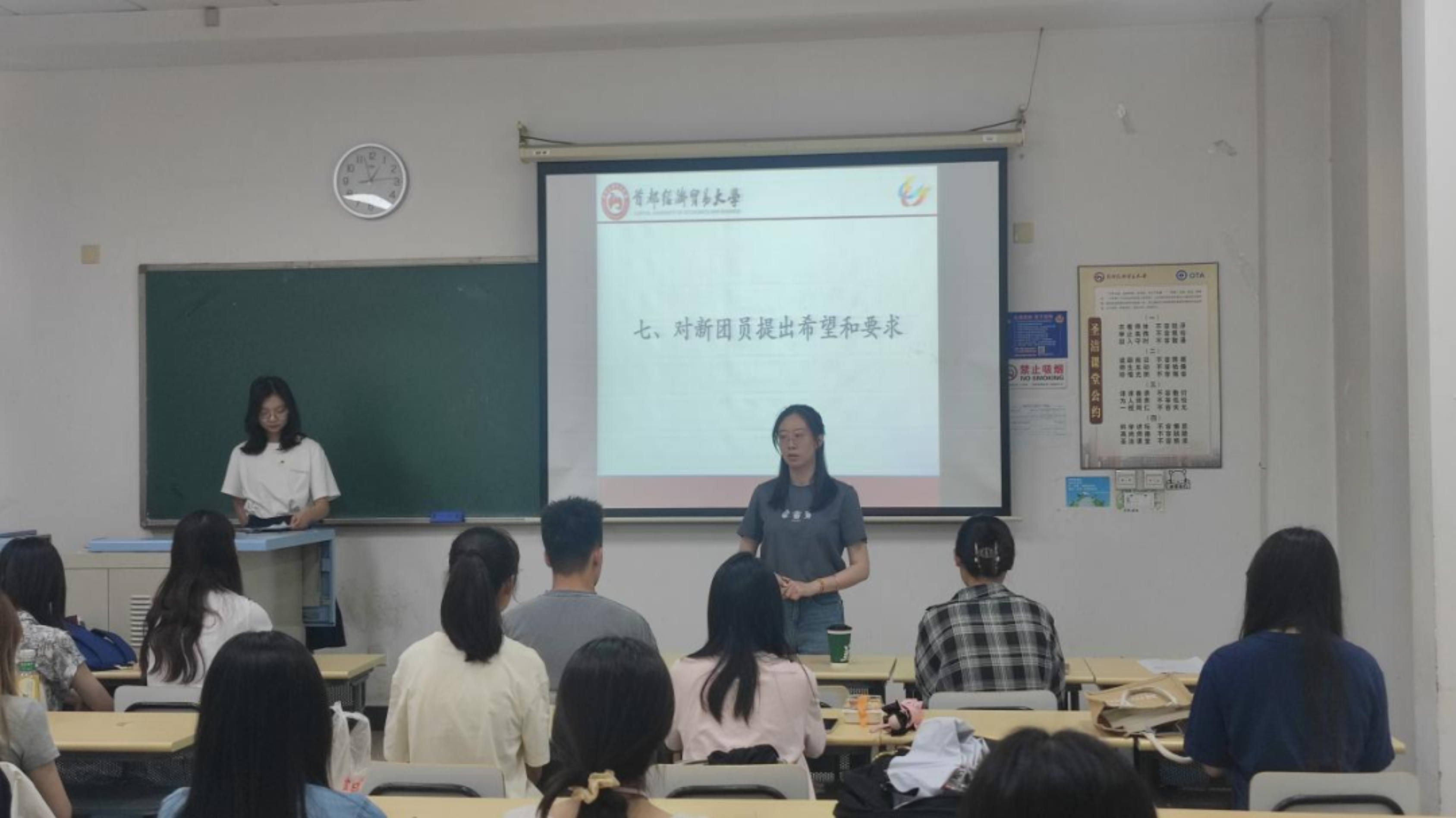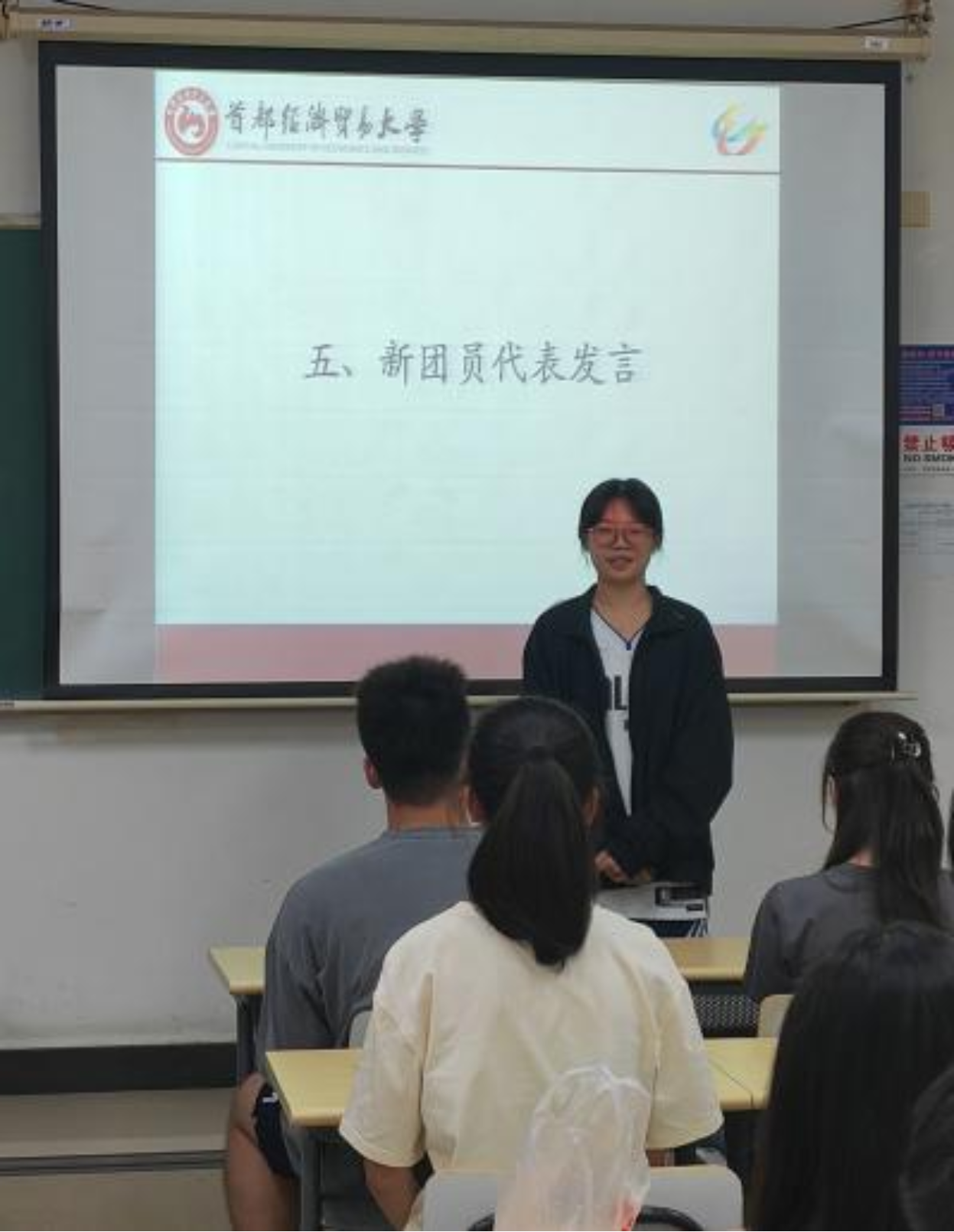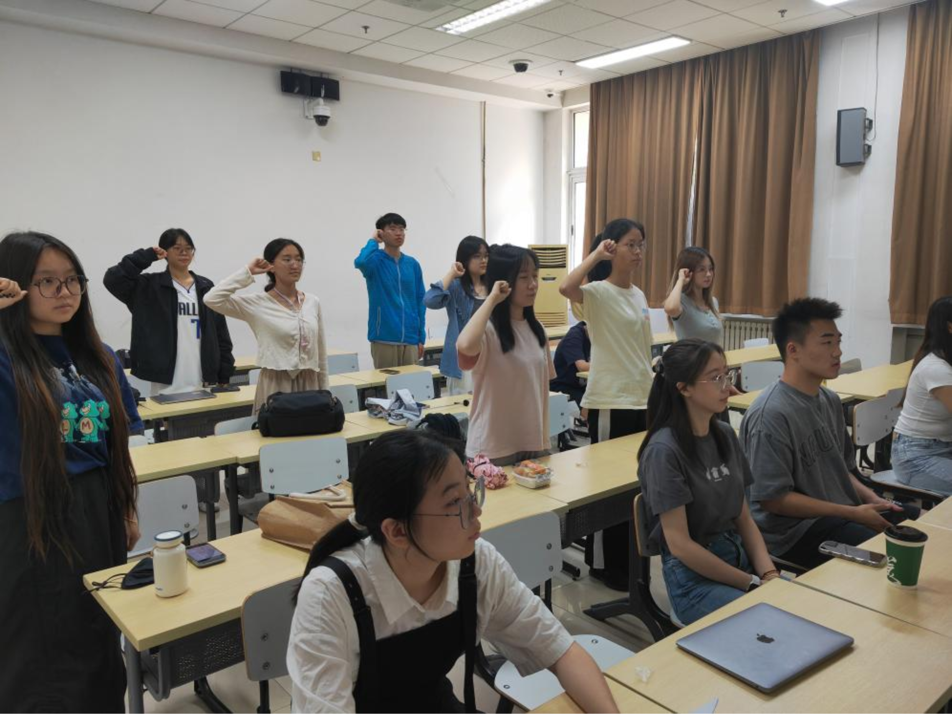 在庄严肃穆的国歌声中,入团宣誓仪式正式开启。全体人员起立,齐声高唱中华人民共和国国歌。随后,组织部部长韩璐仪宣布吕沐、吴可菲等十位同学成为新发展团员,这是他们青春道路上的重要一步,并向这十位新团员表示热烈的祝贺。