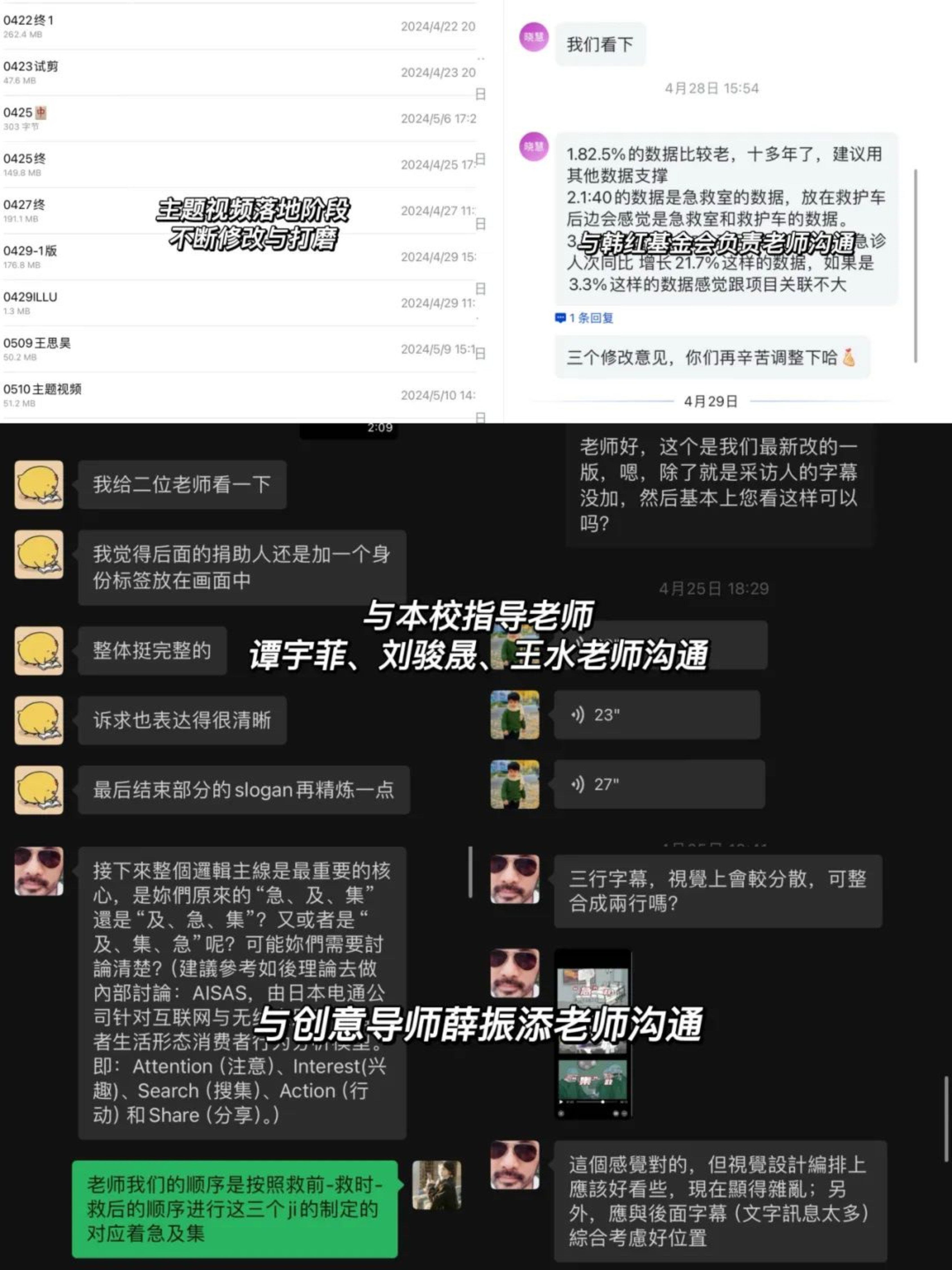 主题视频的后期剪辑是最“折磨”人的部分。在定稿前尝试的两种剪辑风格与成片,都被更专业的指导意见推翻,被推翻的一瞬间,内心确实十分崩溃,信心受到极大打击。但一次次的碰撞和修改让我们逐渐把握了讲故事的节奏,掌握了剪辑的更多技巧,不再像之前一样仅仅进行内容的简单堆砌,而是更注重画面的流畅性和节奏感,力求通过镜头语言和音乐氛围营造紧张而有序的急救场景;120秒的背后是几十个小时的反复斟酌细节,这些过程让我们深刻体会到了视频制作的精细化和专业化。