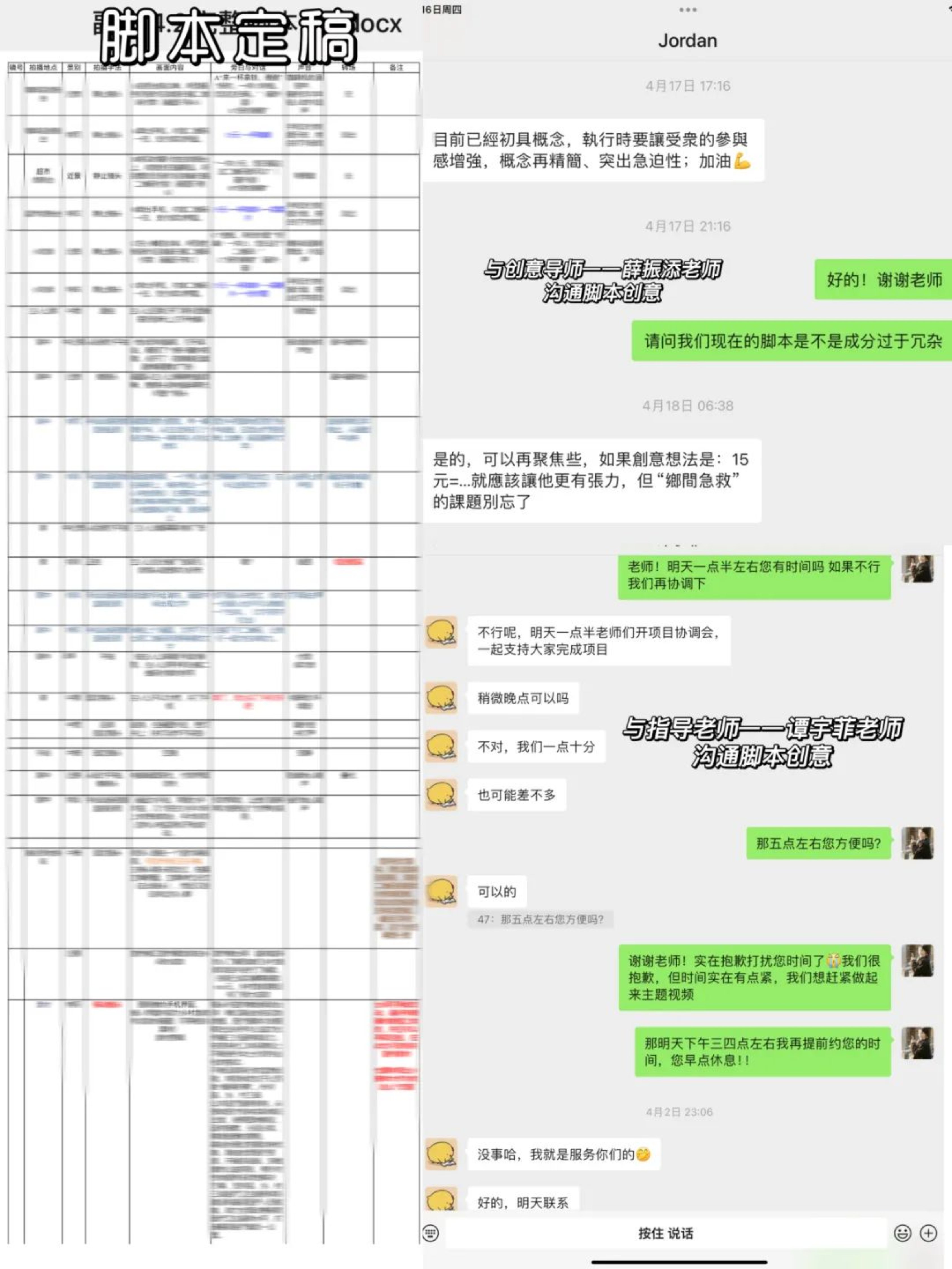 脚本的创作与视频的主题思考贯穿整个视频制作的全程。第一版脚本的雏形是将所有人创意中最有特点的地方汇总连接起来,但最初并没有一个完整的叙事链。在后来的几次修改中,我们尝试了讲几个故事不同故事、讲一个人的故事、裁剪故事的片段组合成一个混剪在中间加入素材等不同形式。最后以一个素材结合手绘的方式把宣传视频讲述出来。在初创阶段,指导老师与创意导师不断与我们进行沟通与交流,为我们视频脚本制作注入了更专业、可行性更强的方案。