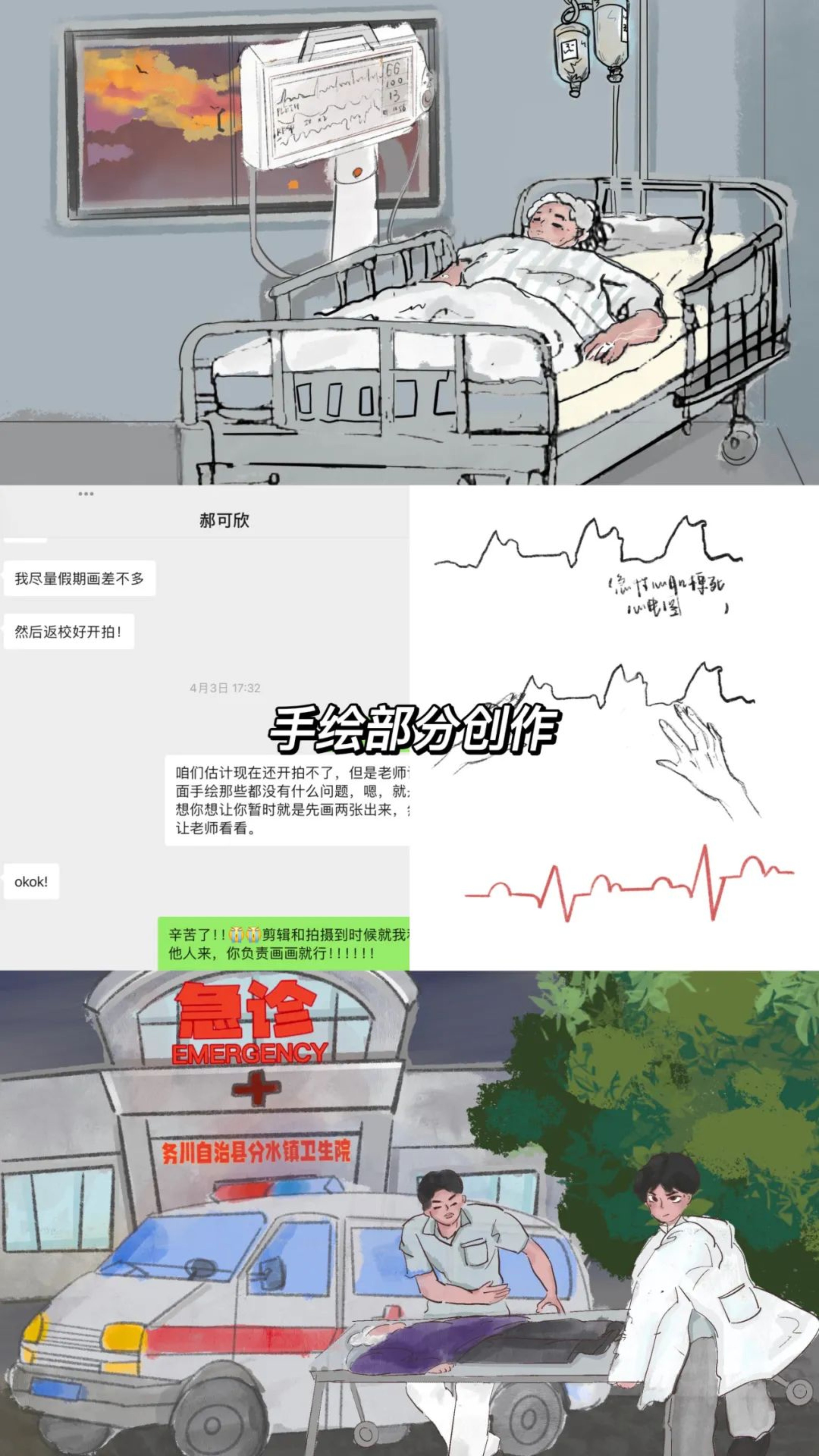 在主题视频中,我们一大亮点便是插入了手绘。在创作过程中,最主要的困难是如何将公益组织提供的原始素材用手绘的方式呈现出来,以及如何将乡村地区的特色与急救事业相结合,用画笔呈现出独特而动人的画面。经过小组讨论和查询类似案例,我们决定选取原始素材中最具有代表性的画面进行手绘。组内主要负责手绘的同学更是日夜加班、反复修改,只为呈现出最好的效果。
