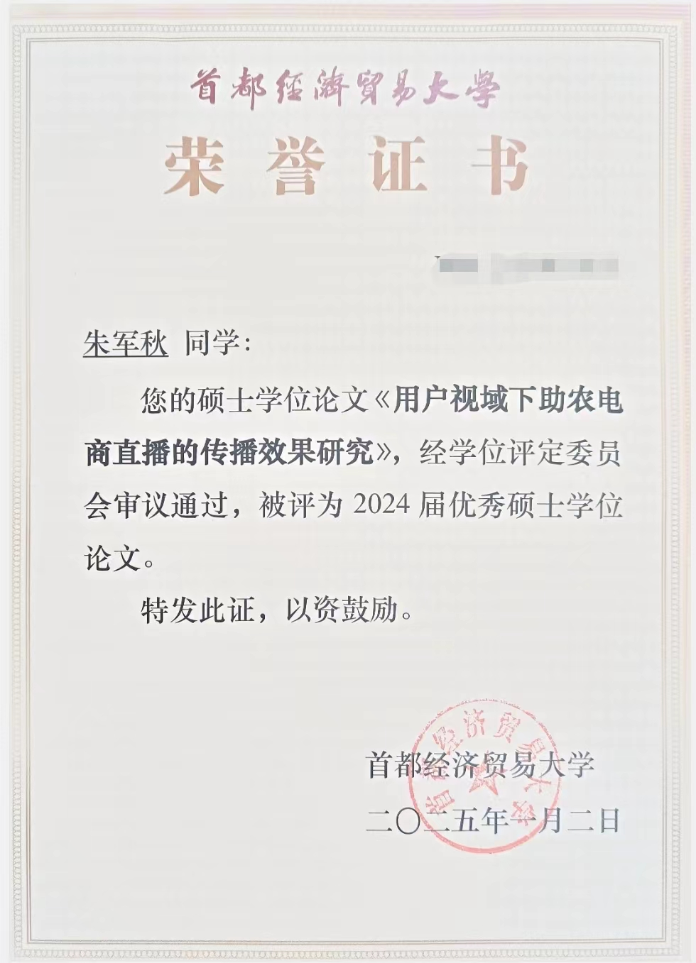 2024年12月,研究生院组织开展优秀研究生学位论文评选工作,17直播2024届硕士研究生朱军秋同学的硕士毕业论文《用户视域下助农电商直播的传播效果研究》脱颖而出,成功入选。该论文在石刚教授的悉心指导下完成,展现了扎实的学术功底与创新的研究视角。