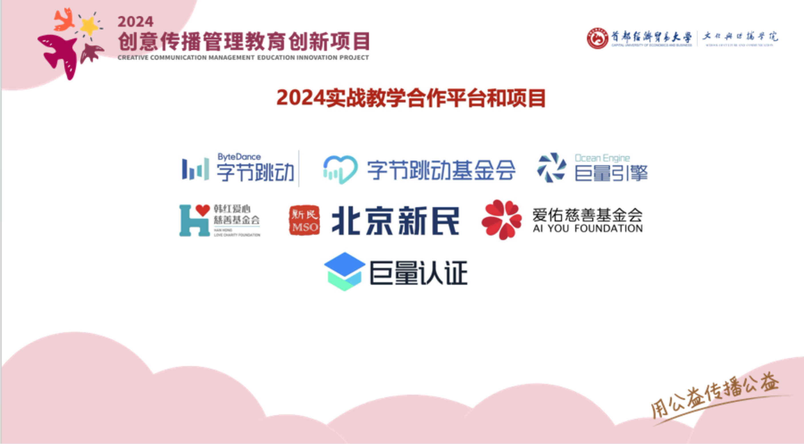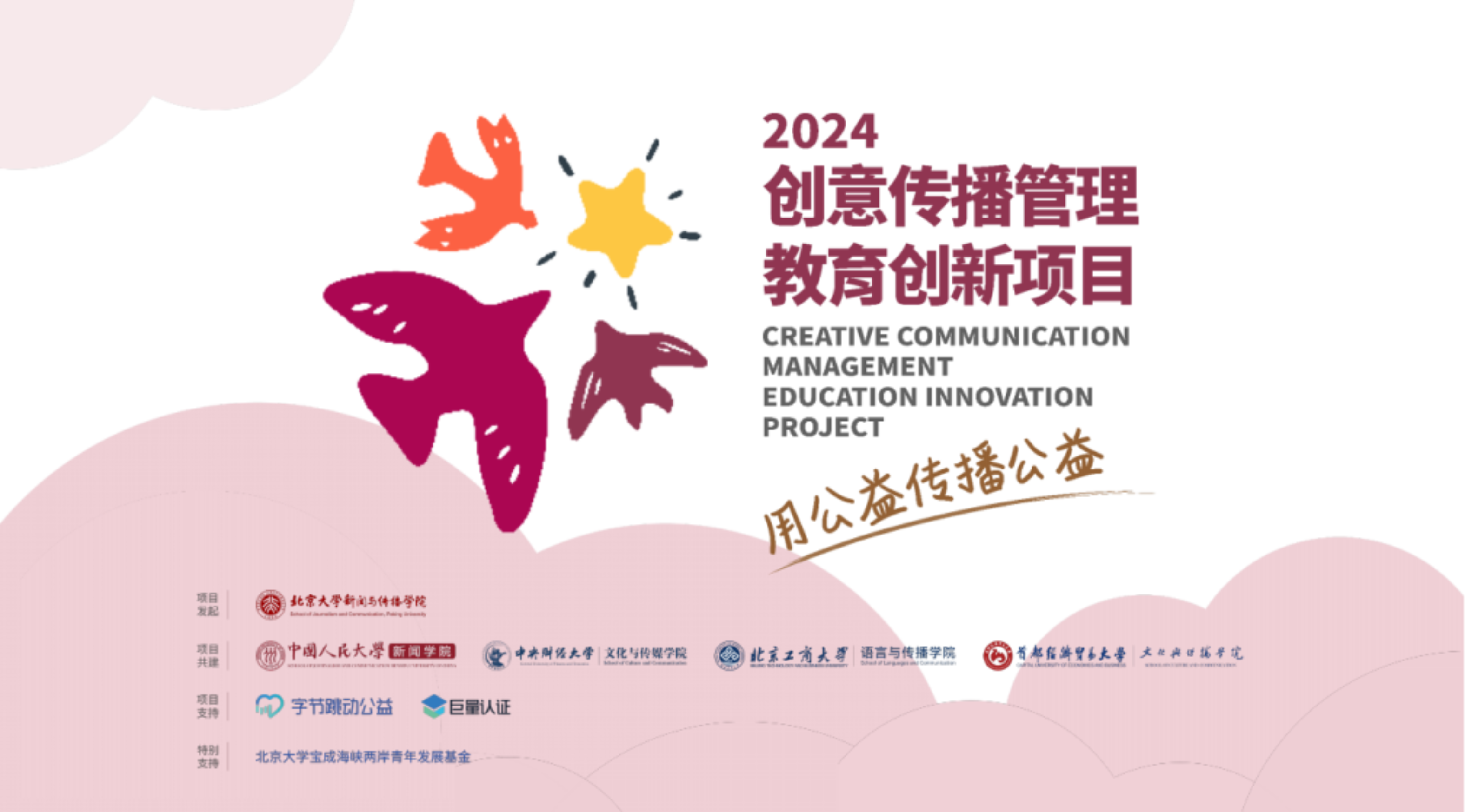 “2024创意传播管理教育创新项目”由北京大学新闻与传播17直播 发起,联合中国人民大学新闻17直播 、中央财经大学文化与传媒17直播 、17直播 、北京工商大学语言与传播17直播 实现五校共建。项目得到了字节跳动公益、巨量认证、北京大学宝成海峡两岸青年发展基金的大力支持。另外,香港城市大学也作为观摩院校参与其中。