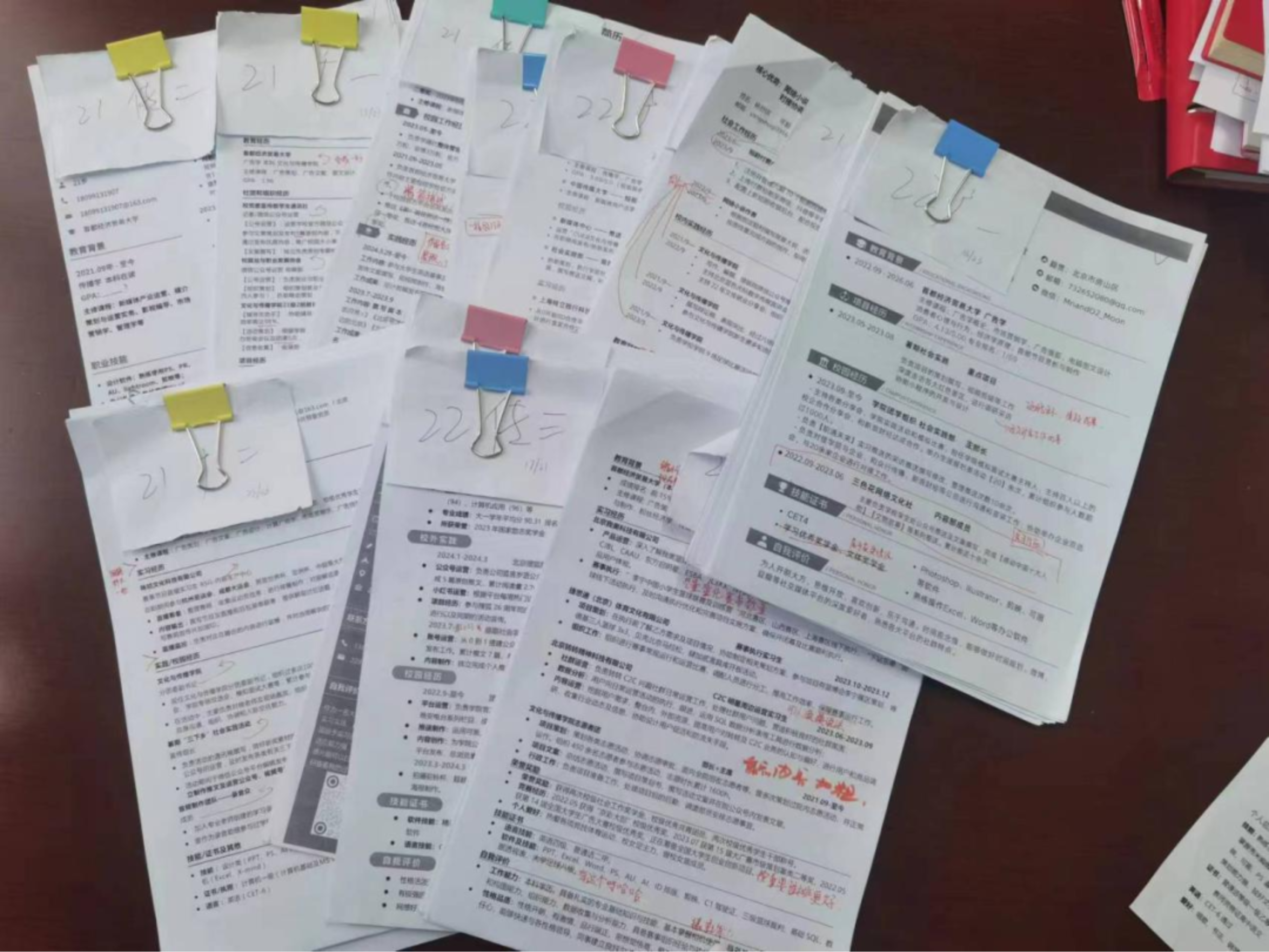 4月20日至5月10日,17直播 成立指导工作小组,成员们逐份翻阅,为同学们修改、评审简历,用红笔将问题一一圈出,并在一旁仔细批注,帮助同学们优化简历。