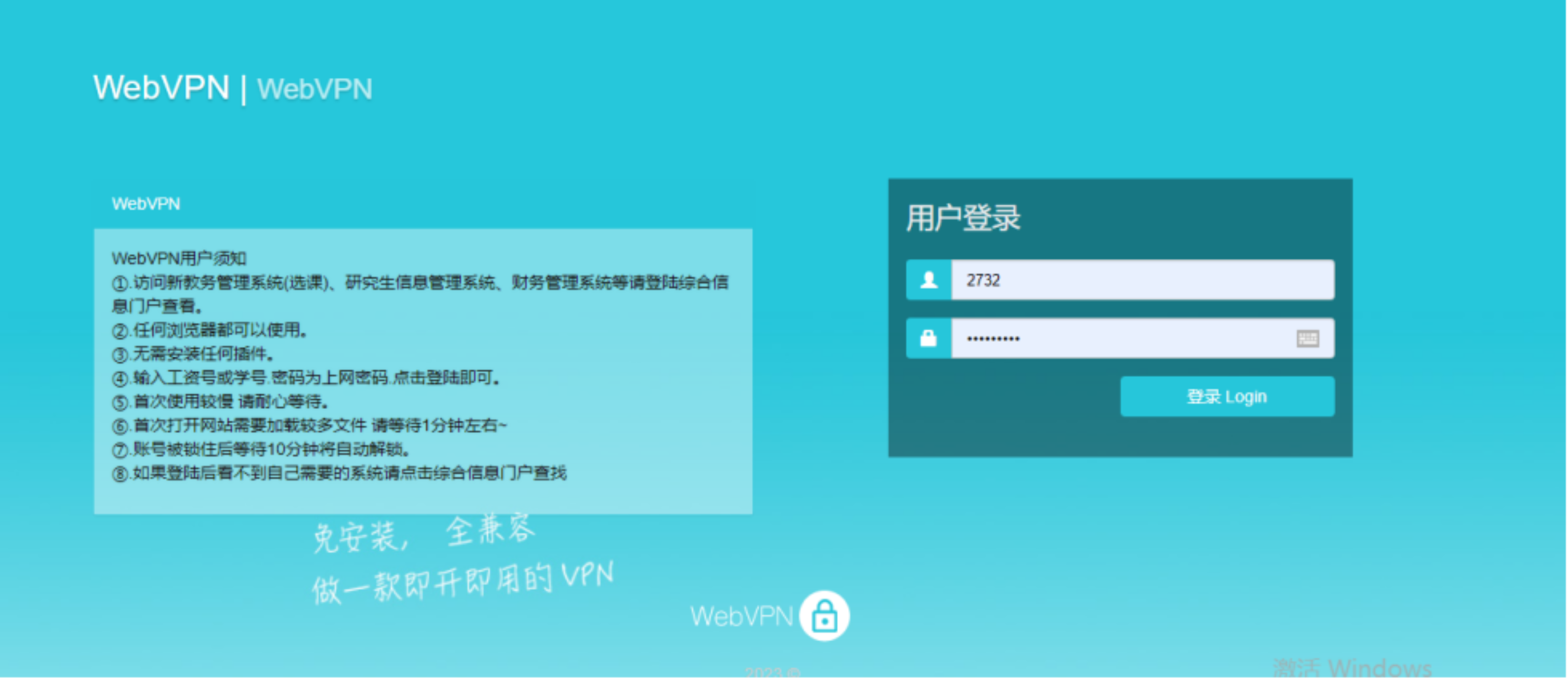 使用自己的校园网账号和密码(账号:教职工为工号,学生为学号,密码为上网密码)登录;