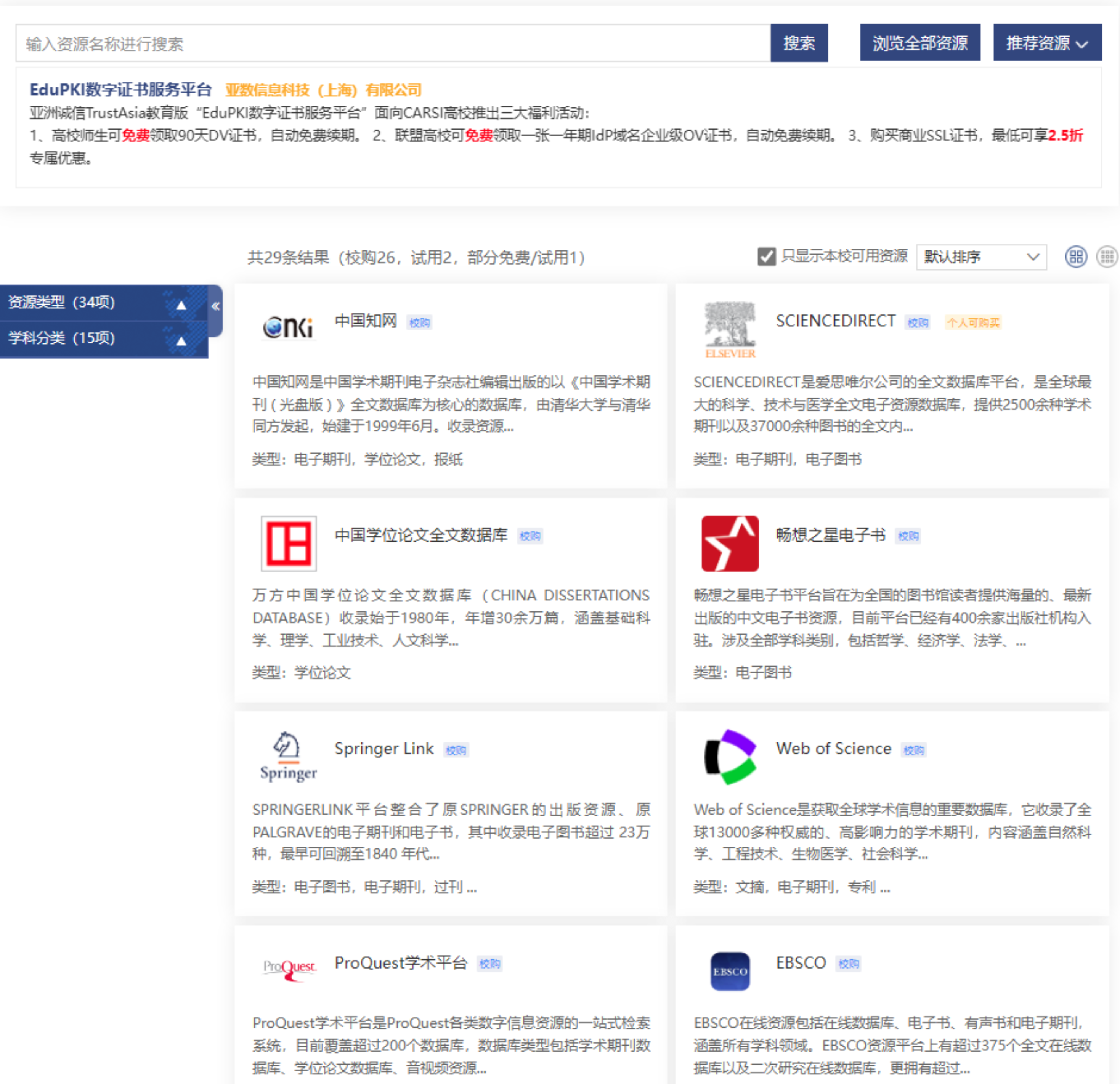 目前,图书馆已开通CARSI服务的数据库有:中国知网、人大复印报刊资料、万方学位论文数据库、北大法宝、EPS、RESSET、起点考试网、起点考研网、MeTel教学资源库、道琼斯全球资讯教育平台、超星发现系统、中文在线、Springer、EBSCO、GALE、Wiley、Oxford、Emerald、Cambridge Core在线回溯库、Taylor & Francis数学与统计学科数据库 、ProQuest ABI-inform数据库、Web of Science、ProQuest学位论文全文检索平台、ProQuest Ebook Central和ScienceDirect(Elsevier)期刊数据库等,快快利用起来吧!