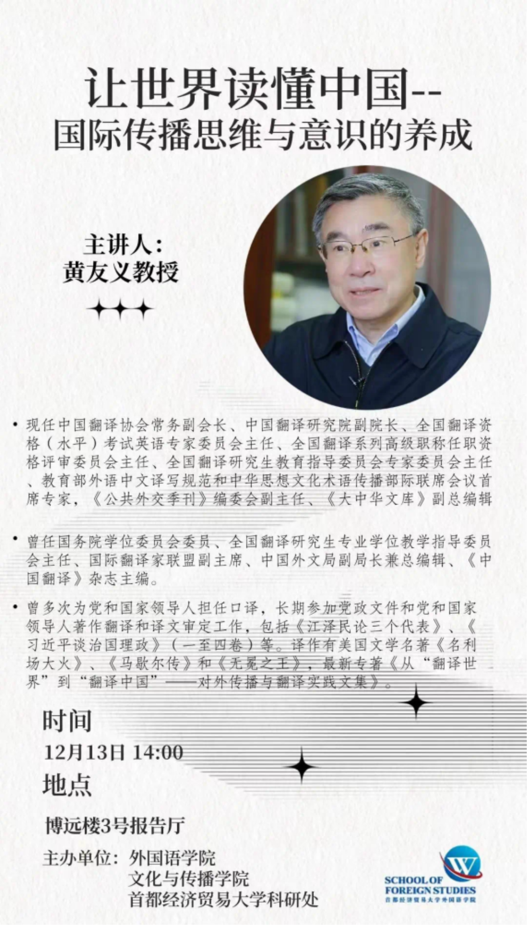 文传讲堂旨在为文传学子提供更多学术交流机会,提高专业素养,拓展眼界,培养出走在时代一线的高水平新闻传播人才。