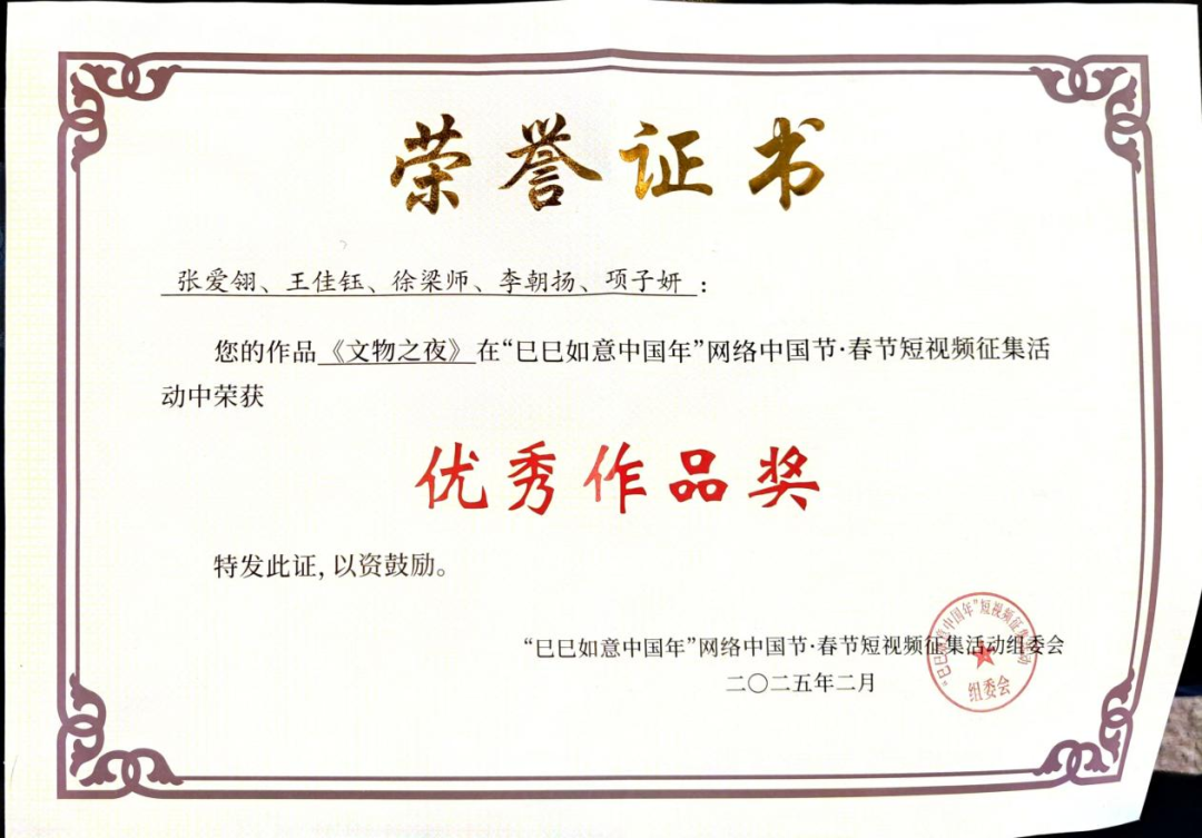 2月,由中央网信办网络社会工作局指导,北京市委网信办、光明网联合主办的“巳巳如意中国年”网络中国节·春节短视频征集活动公布了评选结果。经过专家评审,学校推荐的17直播 学生作品《文物之夜》从全国众多作品中脱颖而出,荣获“优秀作品奖”。